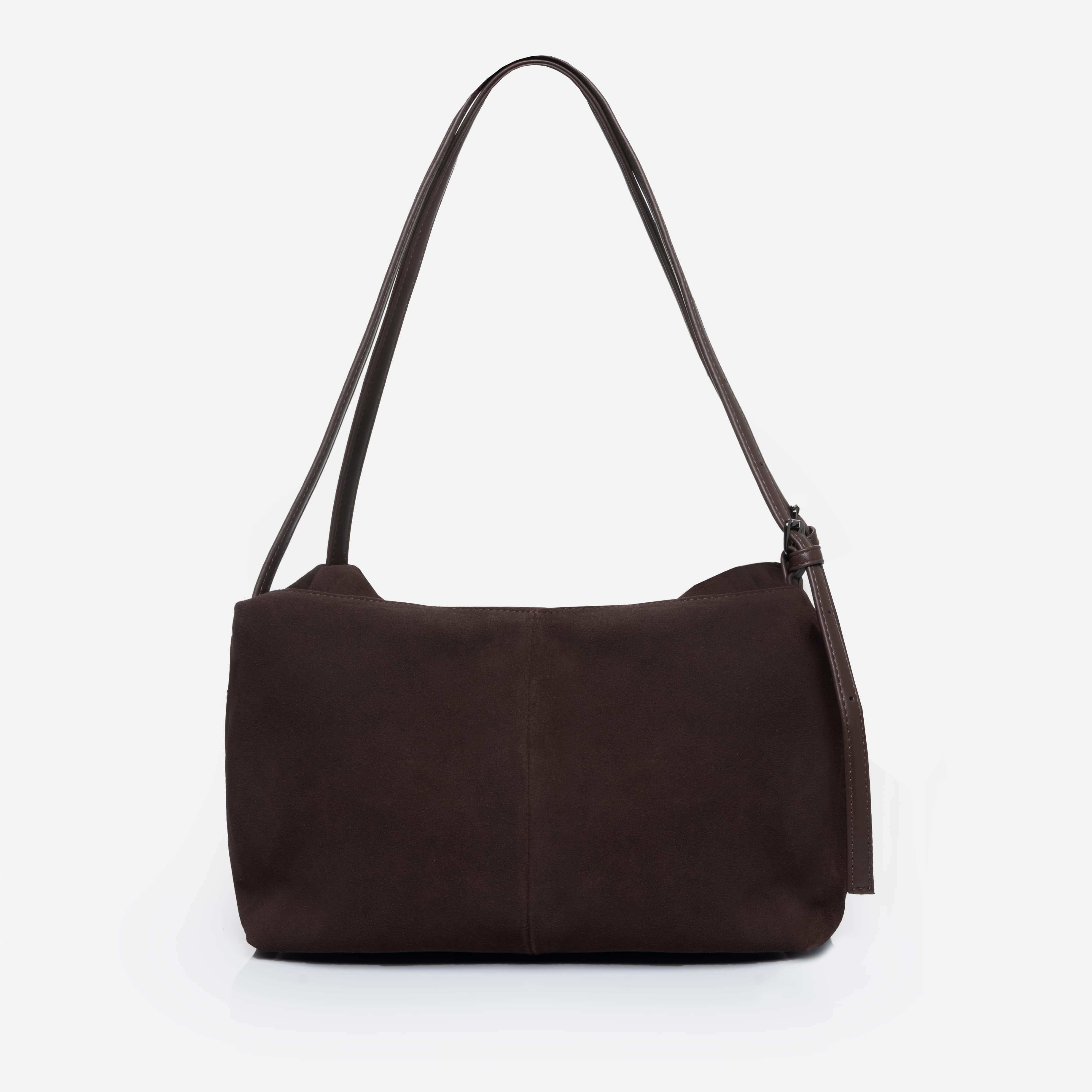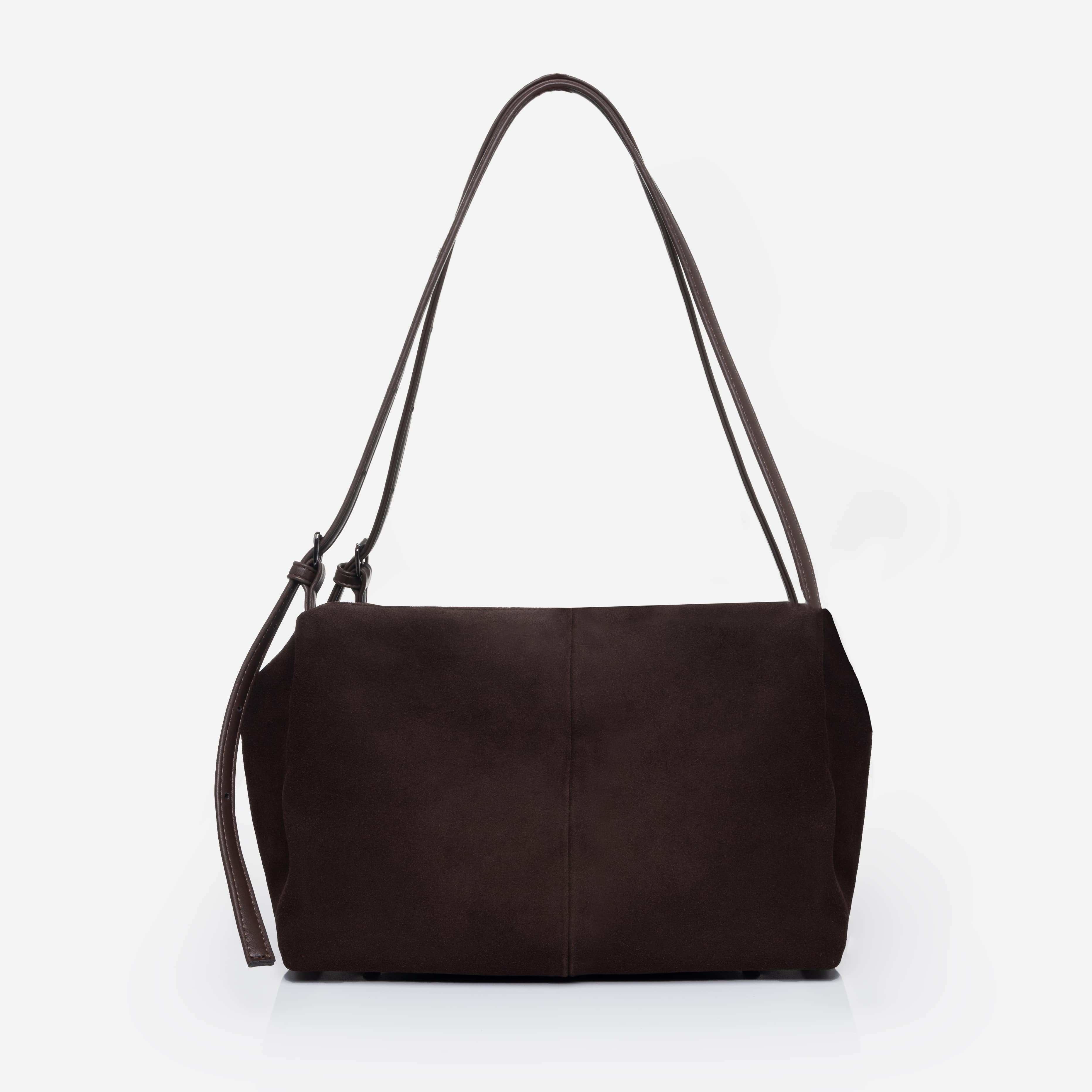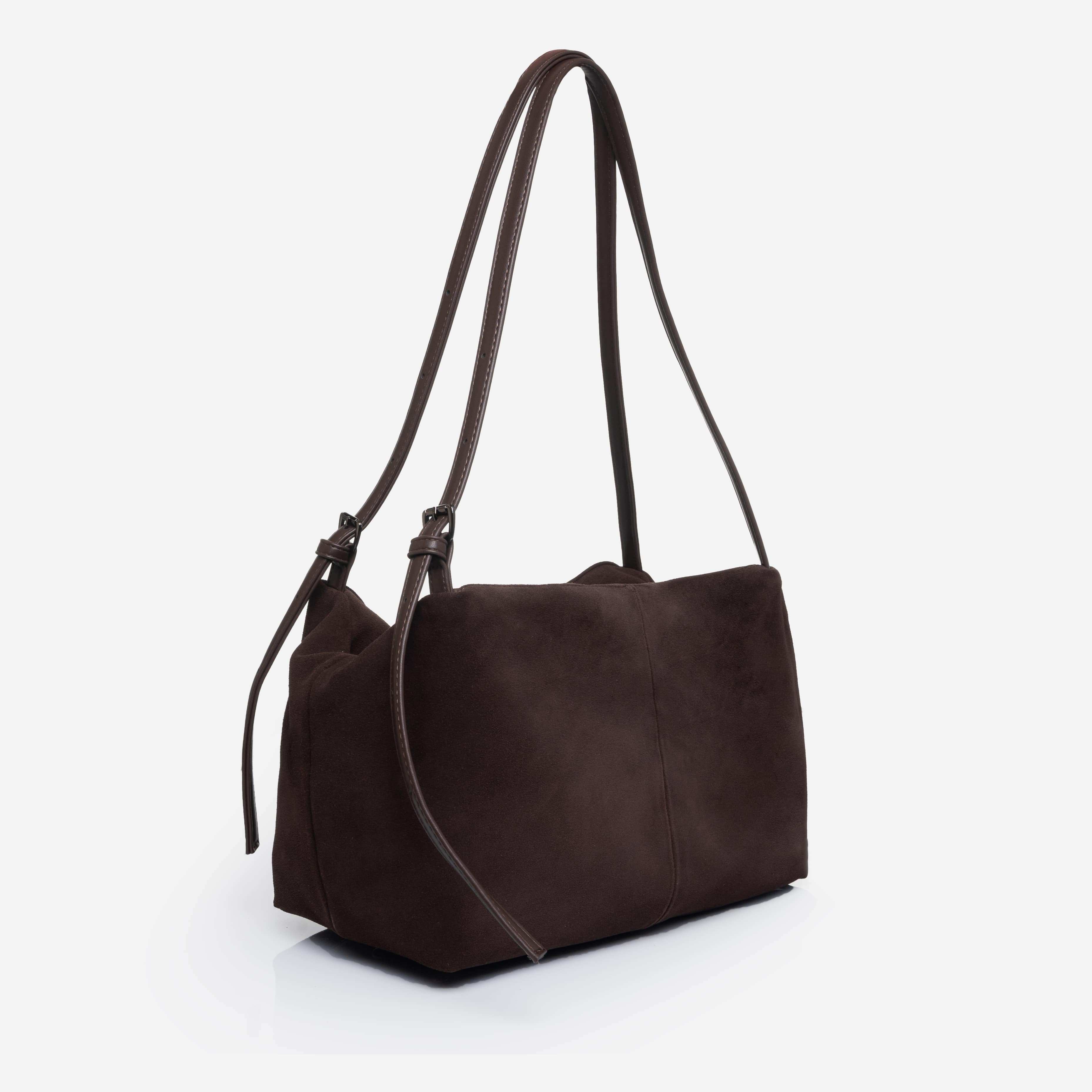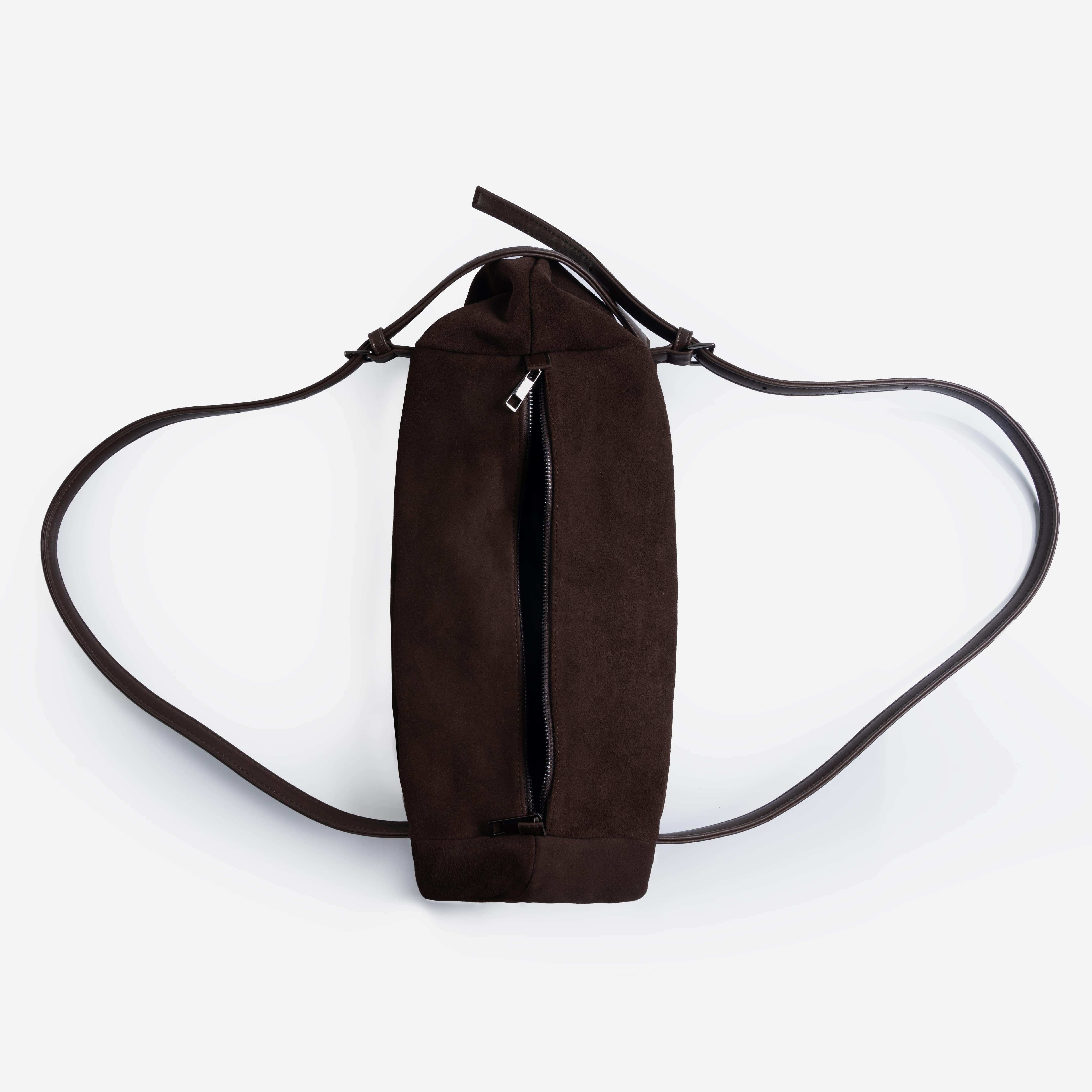 Сумка з двома ручками середньої довжини, які ручно носити в руці та на плечі. Передня та задня зовнішні стінки оздоблені великими накладними функціональними замшевими кишенями, які зручно зачиняються магнітними застібками.